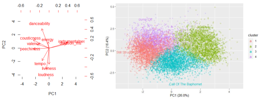 Overall, clusters did not conform well to a given genre. To help break down cluster attributes, PCA was performed. Contributions of Principal Component 1 (PC1) and Principal Component 2 (PC2) are shown in Figure 3, alongside the dataset plotted in PC space.