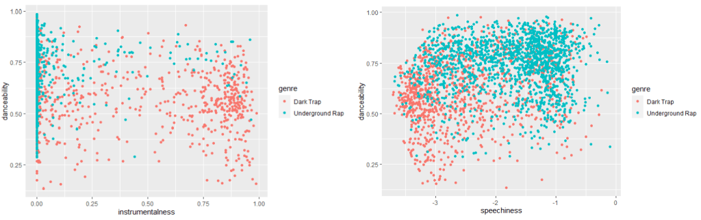 For SVM to be effective, clusters should be separable along some dimensions. These plots are examples of genre separation along song attributes.